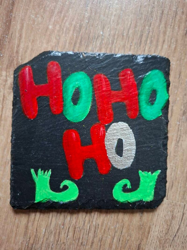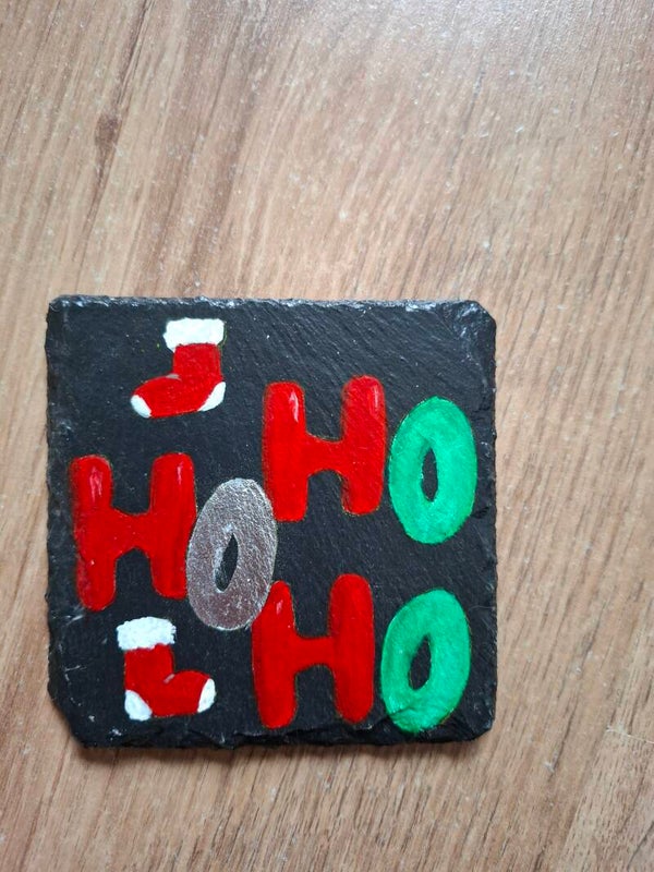 Breng de kerstsfeer op tafel met deze set van 6 handbeschilderde leistenen onderzetters met de feestelijke tekst HOHOHO. 🎅✨