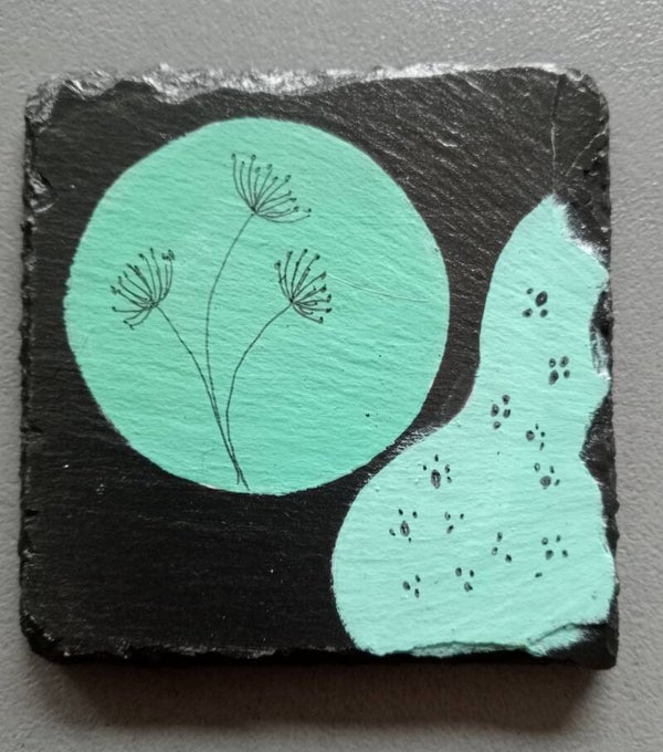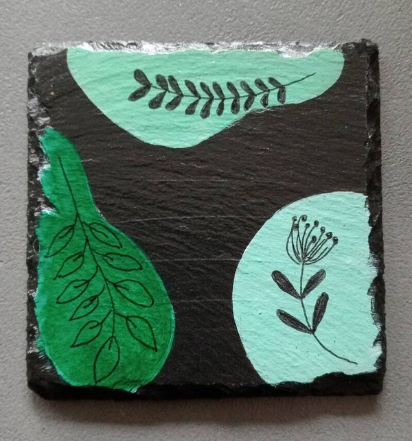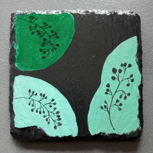 Betreed een oase van rust en elegantie met onze handbeschilderde leistenen onderzetters, voorzien van verfrissende groene vlakken en fijne zwarte takjes.