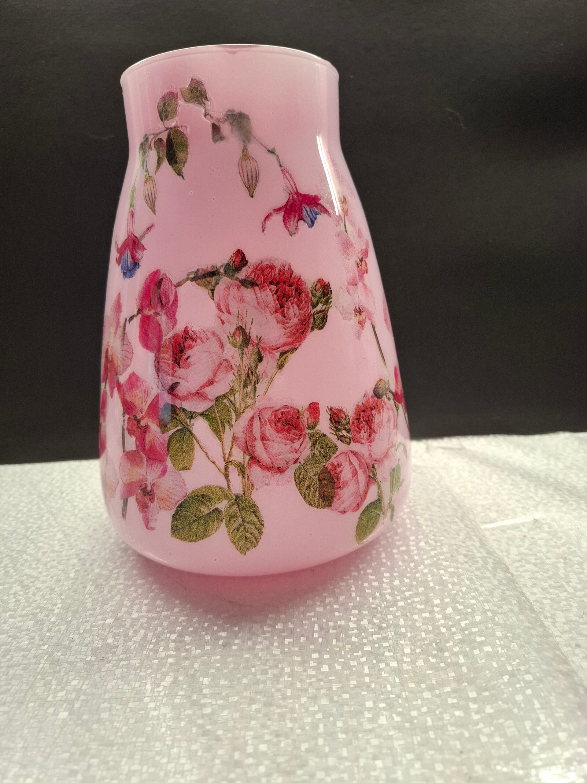 Een glazen vaas in een zachte roze tint, aan de binnenkant bewerkt met servetten met daarop orchideeën takken en afgelakt met roze verf.