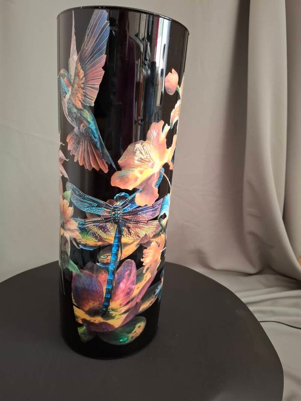 Te gave vaas met een lama, libelle en kolibrie met reverse decoupage