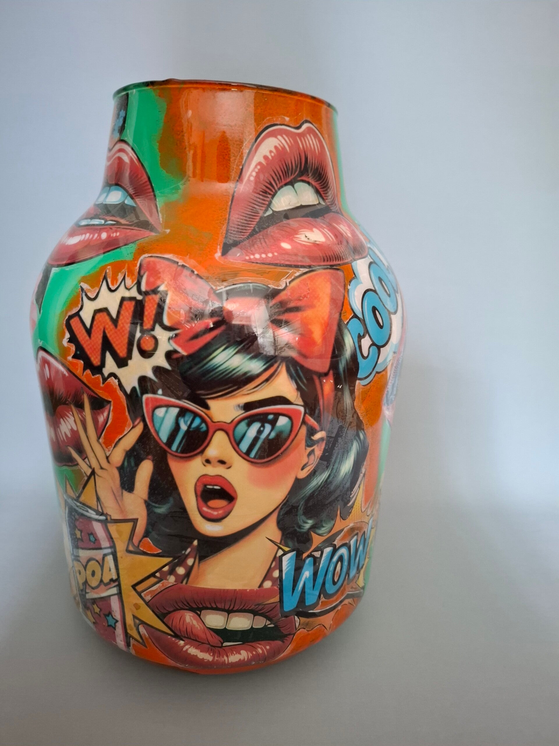 Wil je jouw interieur een moderne, speelse twist geven? Wat vind je van deze reverse decoupage vazen met pop art afbeeldingen! Deze opvallende en artistieke vaas brengt de levendige en gedurfde stijl van pop art rechtstreeks in jouw huis. Met zijn kleurrijke en grafische patronen is deze vaas niet alleen functioneel, maar ook een waar kunstwerk die direct de aandacht trekt. Ideaal voor iedereen die houdt van een creatieve en eigentijdse inrichting!