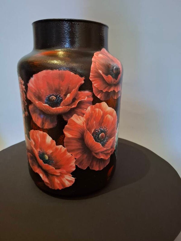 Deze decoupage vaas heeft een verfijnde en moderne uitstraling, waarbij de intense rode klaprozen het middelpunt van de aandacht vormen. De delicate bloemen worden omlijst door een elegante afbeelding van een vrouw, die wordt omringd door rode bloemen. De combinatie van klaprozen en vrouwelijke schoonheid symboliseert kracht en kwetsbaarheid, wat deze vaas perfect maakt voor liefhebbers van kunst en natuur.