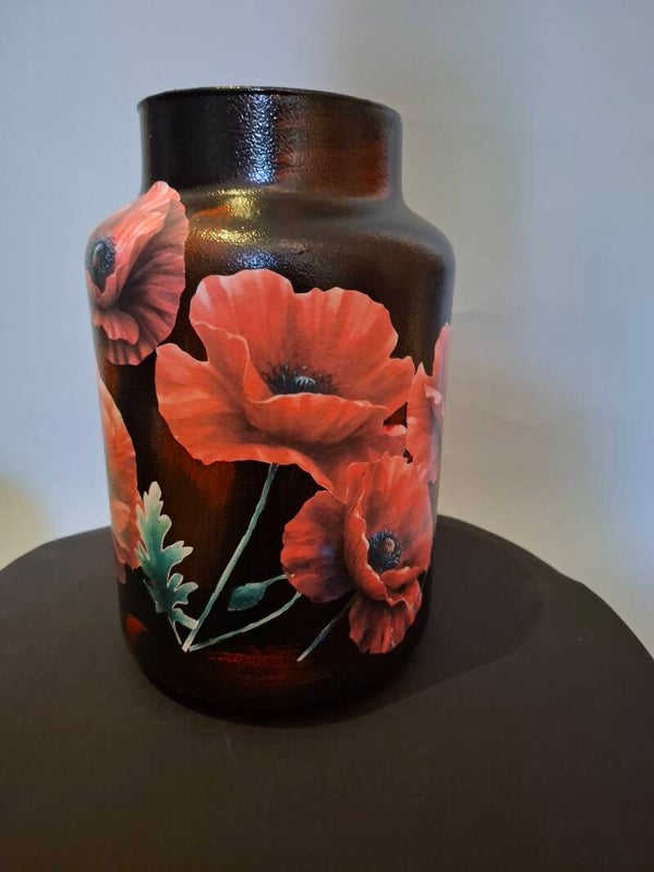 Deze prachtige decoupage vaas met klaprozen en een vrouw met rode bloemen is een uniek decoratief item dat elke ruimte een artistieke en elegante uitstraling geeft. Deze vaas is met de hand gedecoreerd, waarbij een speciale decoupage techniek is gebruikt om de afbeeldingen van de klaprozen en de vrouw in levendige kleuren en gedetailleerde patronen tot leven te brengen. Het resultaat is een verbluffende vaas die zowel functioneel als decoratief is en een stijlvolle toevoeging aan elk interieur.