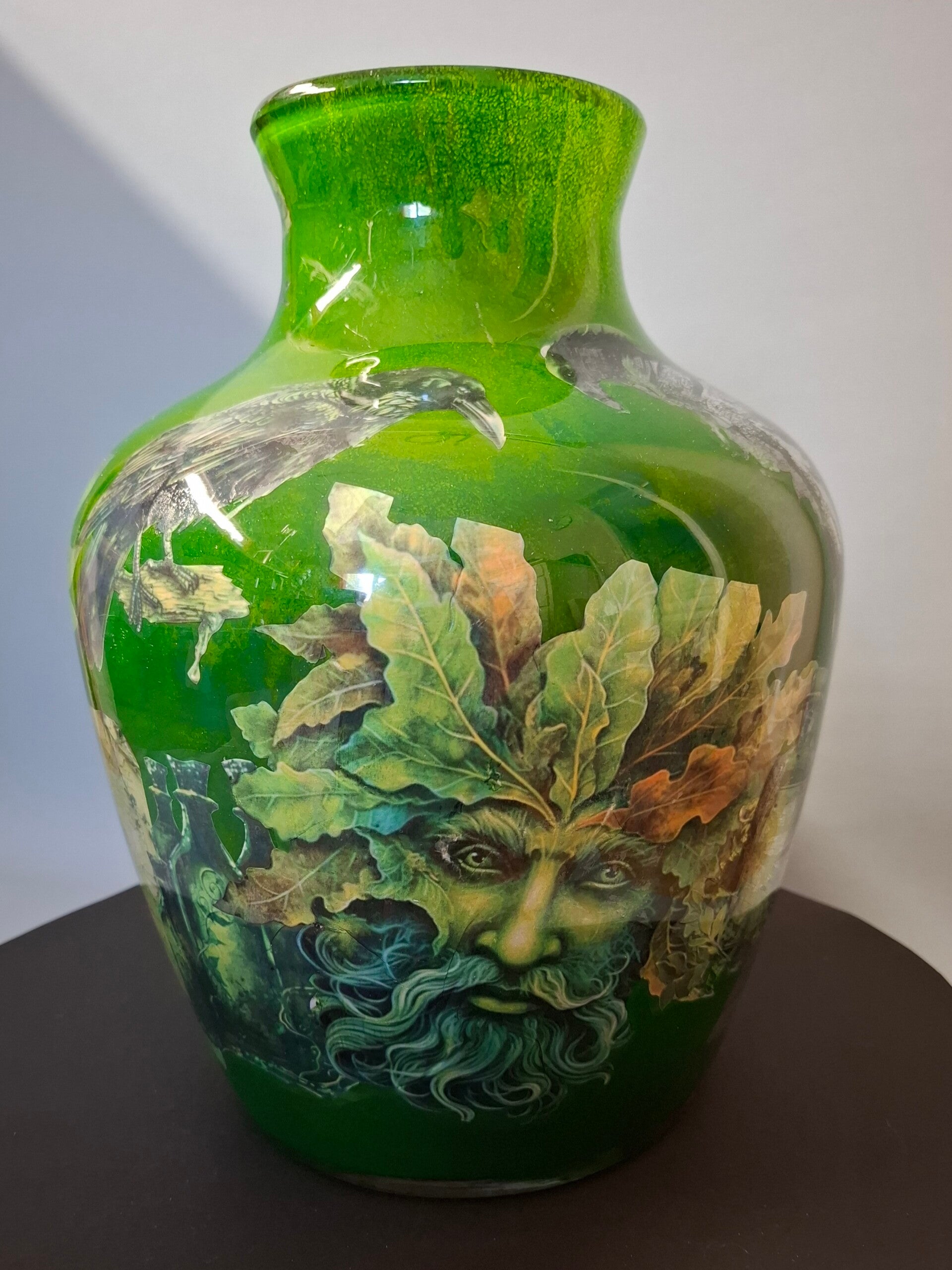 Bij reverse decoupage worden afbeeldingen op de binnenkant van de vaas aangebracht, wat betekent dat je ze door de buitenkant van het glas ziet. De kruikvaas is gesponst met twee tinten groen, wat een dieper en rijker effect aan de afbeeldingen geeft. Het gedetailleerde ontwerp van heksen en mysterieuze gif flessen trekt direct de aandacht en bevat een magische sfeer in elke ruimte. De kruikvorm maakt deze vaas perfect als decoratiestuk op een tafel of kast, waar de afbeeldingen en de laagde groene kleur het beste tot hun recht komen.