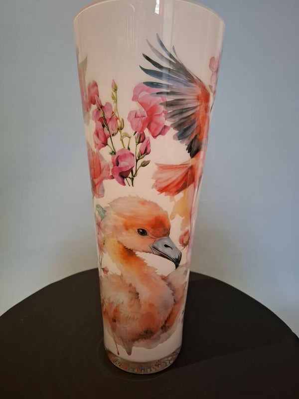Reverse decoupage is een unieke techniek waarbij afbeeldingen op de binnenkant van glas worden aangebracht, zodat ze door de buitenkant zichtbaar zijn. Dit zorgt niet alleen voor een beschermde afbeelding die minder snel slijten, maar ook voor een betrouwbare weergave van details en kleuren. Met de flamingo's in reverse decoupage blijven de kleuren van de vogels prachtig zichtbaar en bestaand de vaas zijn stijlvolle witte afwerking aan de buitenkant.
