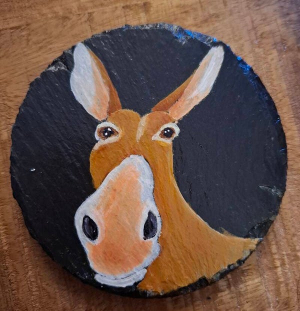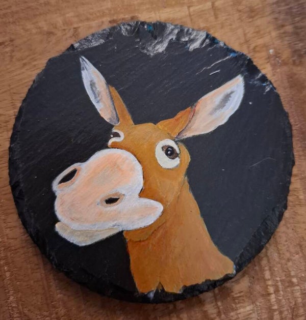 Elke onderzetter is uniek en met de hand beschilderd op stevig natuursteen. Een kunstzinnige én praktische toevoeging aan je interieur, of een bijzonder cadeau voor ezelliefhebbers of dierenfans.