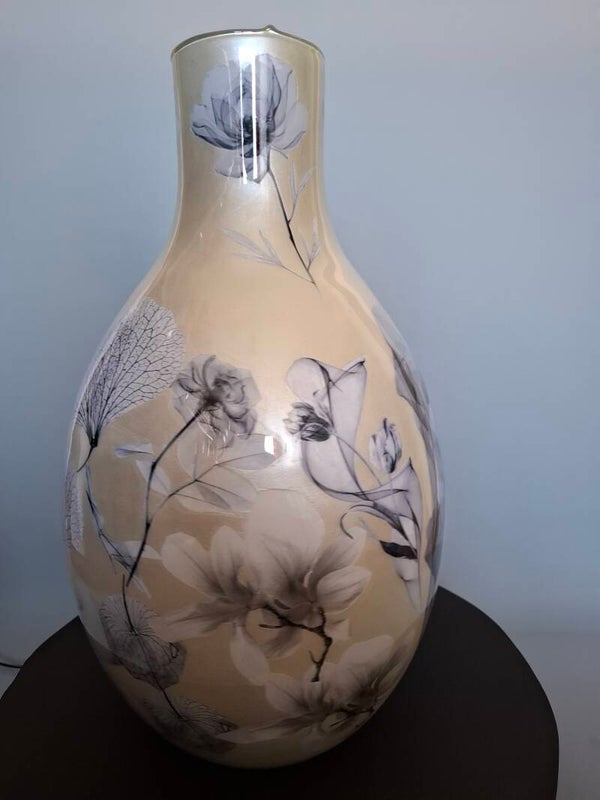 Mooie 50 cm hoge vaas aan de binnenkant bewerkt met zwart/witte afbeeldingen . De vaas is gesponst in parel wit. Door de ronde opening in het midden van de vaas zienje nog een vrouwengezicht. De vaas kun je zo plaatsen met bijv. een mooie (led) kaars, of draai hem om en zet er een mooie bos zijde bloemen in.