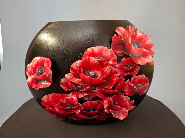De zwarte vaas met klaprozen is 25 cm hoog, 30 cm breed en heeft een opening van 4 naar 15 cm. De vaas is aan de buitenkant bewerkt en kan dus gewoon met water worden gebruikt