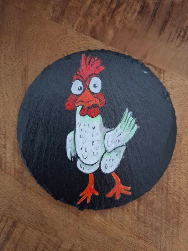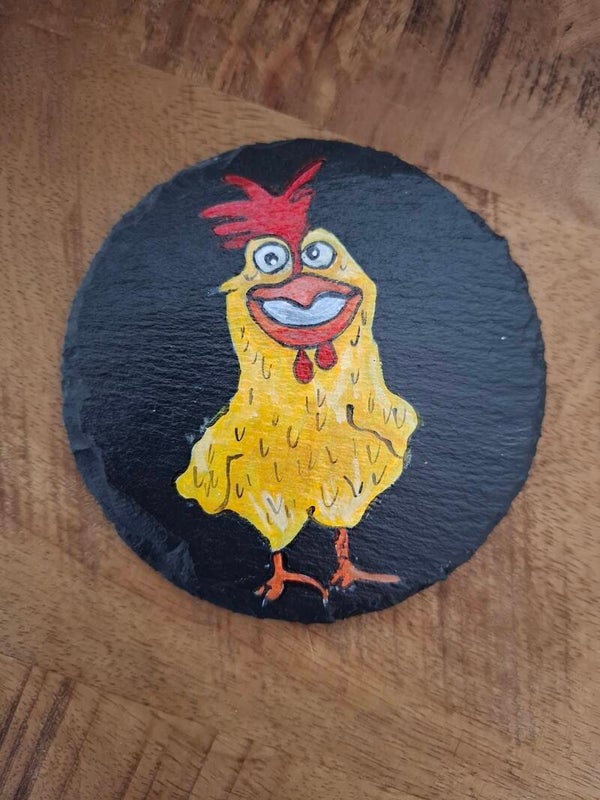 6 leistenen onderzetters, met de handbeschilderd met kippen en hanen in warme tinten geel en wit. Deze onderzetters zijn niet alleen praktisch om je tafel te beschermen, maar ook een sfeervolle toevoeging aan je interieur. Perfect voor liefhebbers van landelijke stijl of een boerderij-touch in huis.