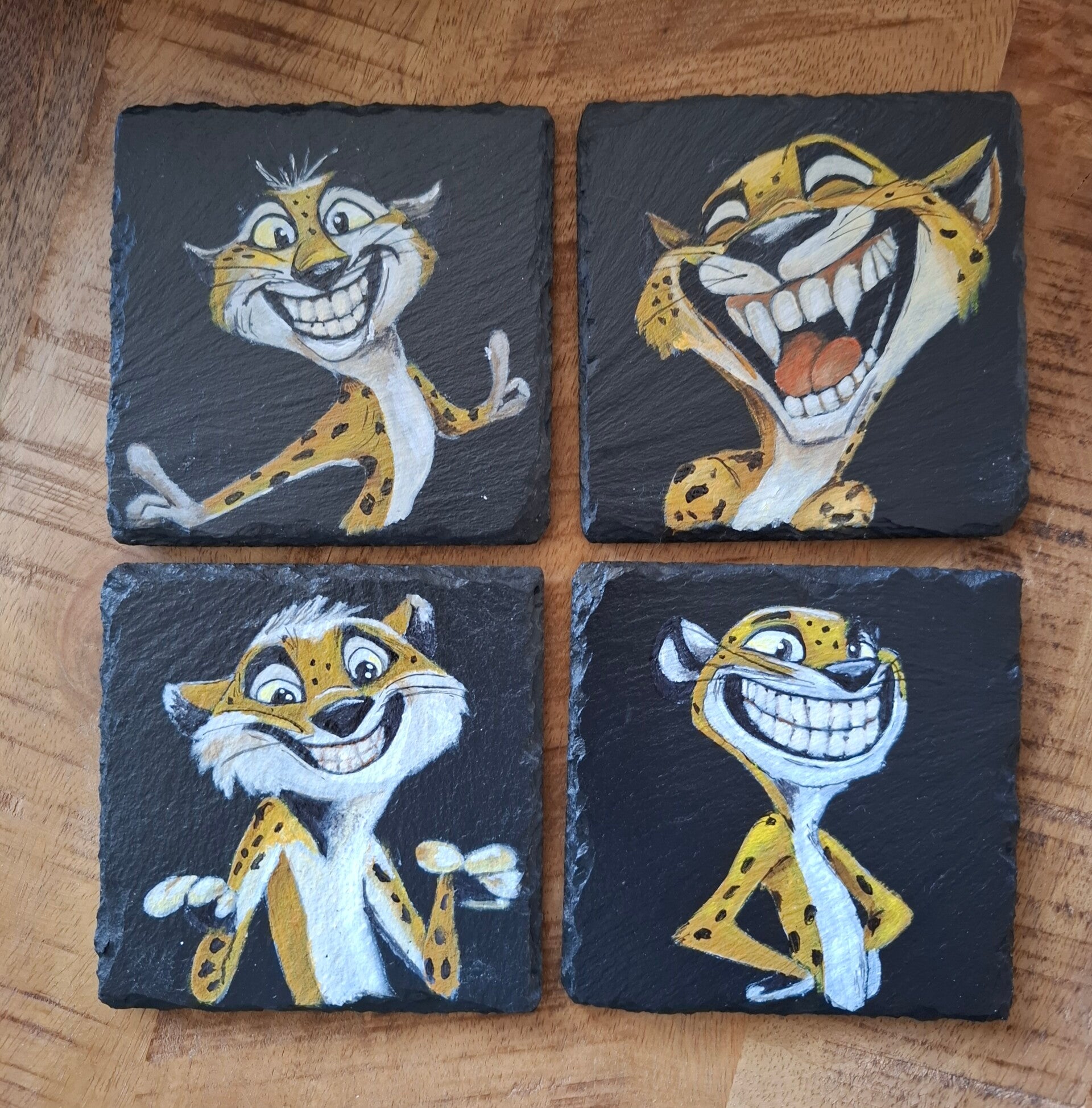 Breng een vleugje speelse jungle naar je tafel met deze handbeschilderde leistenen onderzetters met jachtluipaard in vrolijke cartoonstyle. Elke onderzetter is met zorg met de hand beschilderd, waardoor je niet alleen een functioneel item in huis haalt, maar ook een uniek kunstwerkje. Het stoere design met het speelse jachtluipaard maakt deze onderzetters ideaal voor wie houdt van humor en stijl aan tafel.