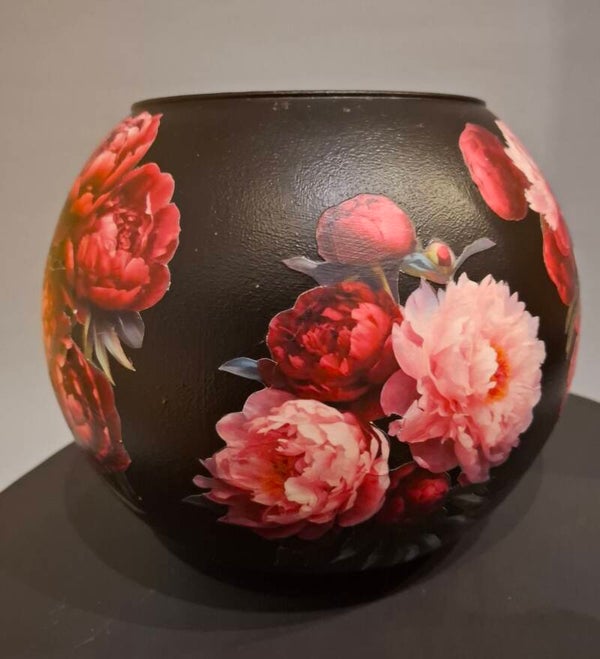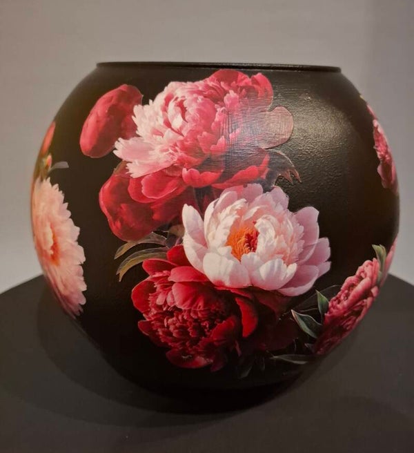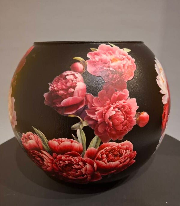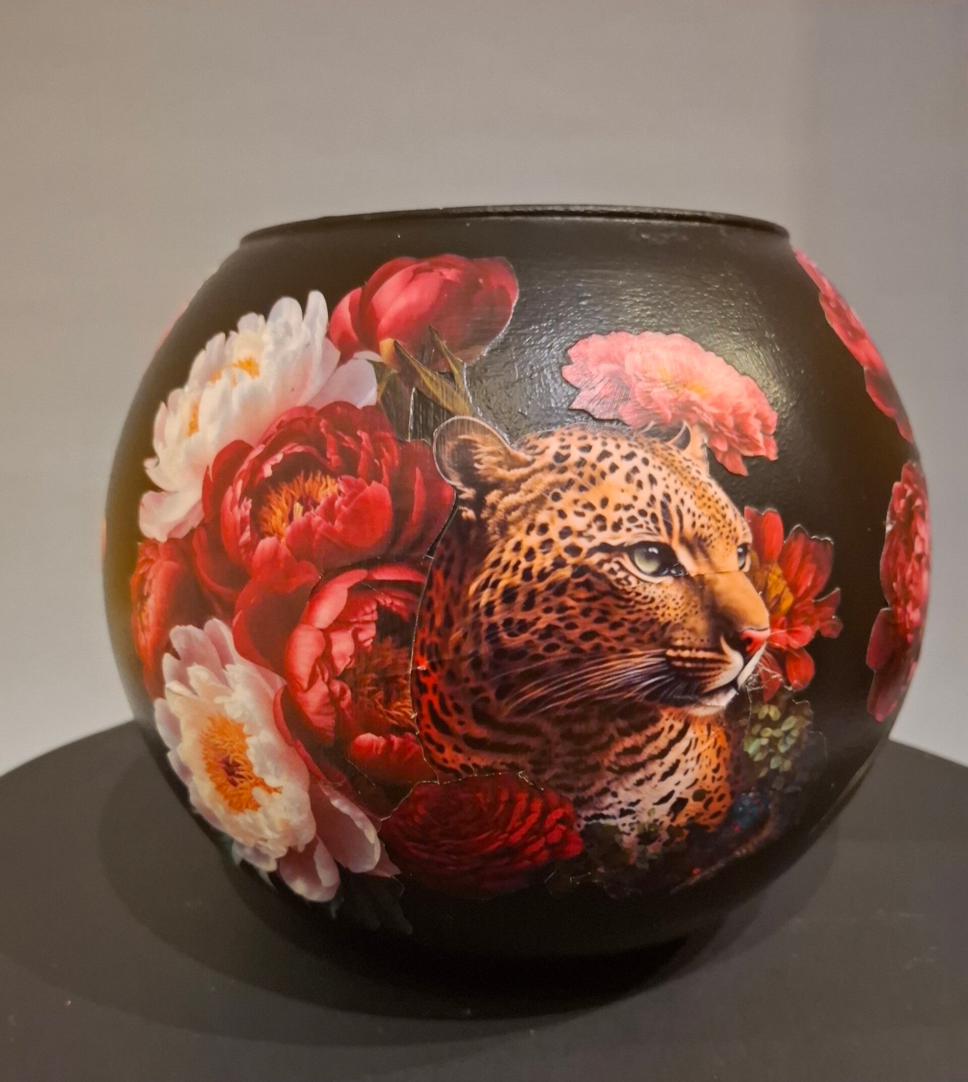 Een elegante zwarte bolvaas, bewerkt met decoupage in diepe rode en donkerroze pioenrozen. Tussen de bloemen verschijnt speels een luipaard, waardoor dit stuk een spannende en artistieke uitstraling krijgt. Met zijn glanzende afwerking is deze vaas een echte blikvanger, perfect als cadeau of om je eigen interieur extra karakter te geven.