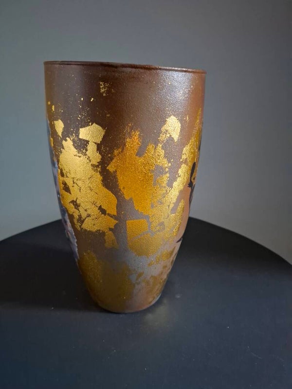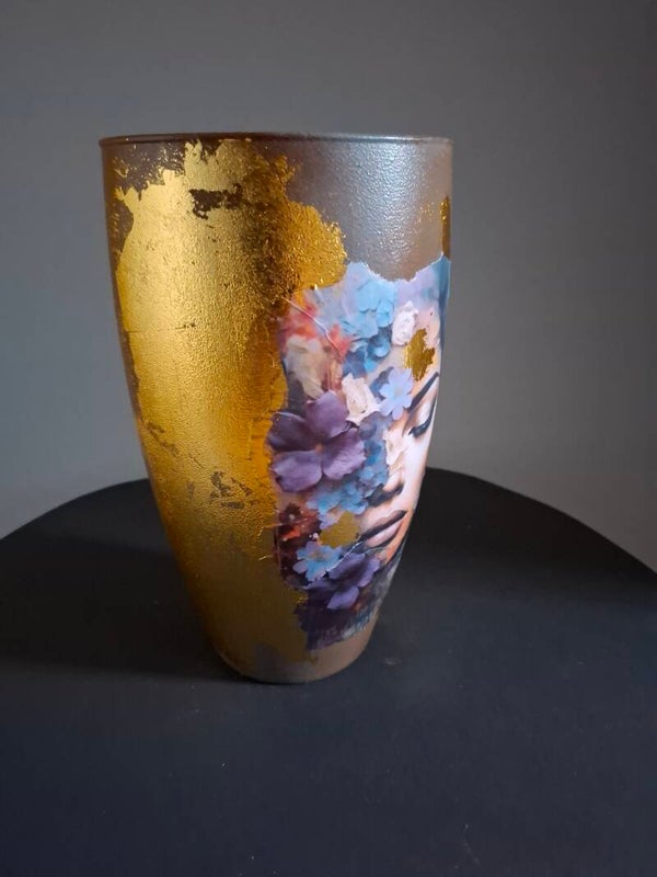 De vaas is bewerkt met decoupage (papier/servetlagen) en daarna afgewerkt met metallic folie en een beschermende toplaag voor langdurige uitstraling.
