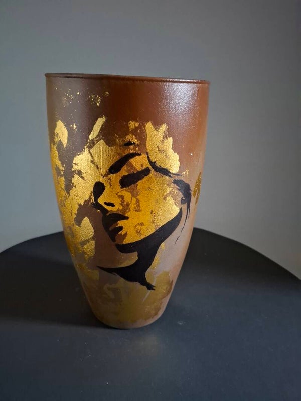 Voeg artistieke luxe toe aan je interieur met deze handgemaakte decoupage vaas in warme bruin- en grijstinten. De vaas is rijkelijk bewerkt met goud metallic folie voor subtiele glans. Aan de ene zijde prijkt een vrouw afgebeeld met bloemen rond haar gezicht; aan de andere zijde zie je elegante, minimalistische contouren van een vrouwengezicht in zwart— een intrigerend samenspel van klassiek en modern.
