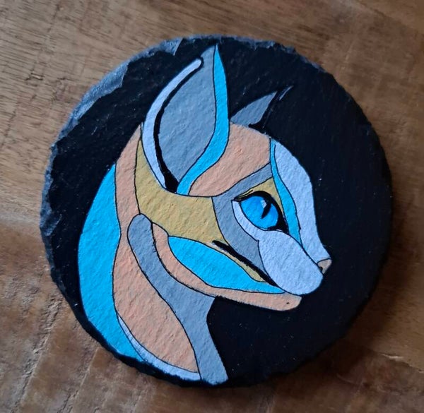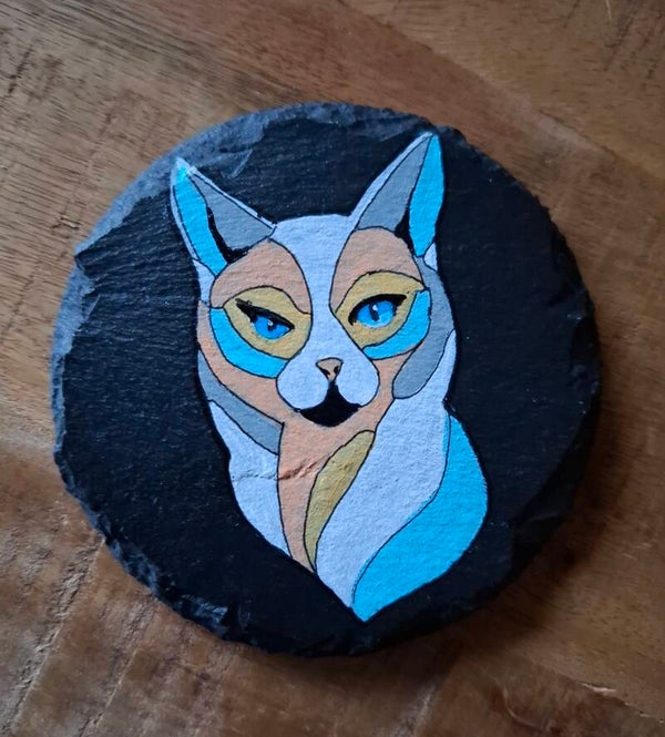 Breng moderne kunst in huis met deze set van vier leistenen onderzetters, elk met een unieke geometrische kat in zachte, lichte kleuren. De strakke lijnen en subtiele tinten geven een eigentijdse uitstraling, terwijl het natuurlijke leisteen zorgt voor een robuuste, luxe afwerking. Perfect voor kattenliefhebbers of als origineel cadeau tijdens de feestdagen.
