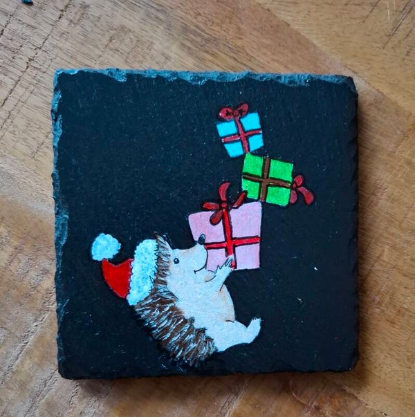 Breng warmte en sfeer in huis met deze handbeschilderde leistenen onderzetters met winter- en kerstafbeeldingen. Elke onderzetter is uniek: een winterkat, een rendier met rode neus, een egeltje met cadeautjes en een vrolijke sneeuwpop. Perfect voor de feestdagen, als decoratief accent of als origineel kerstcadeau. Handgemaakt met oog voor detail en liefde voor het seizoen