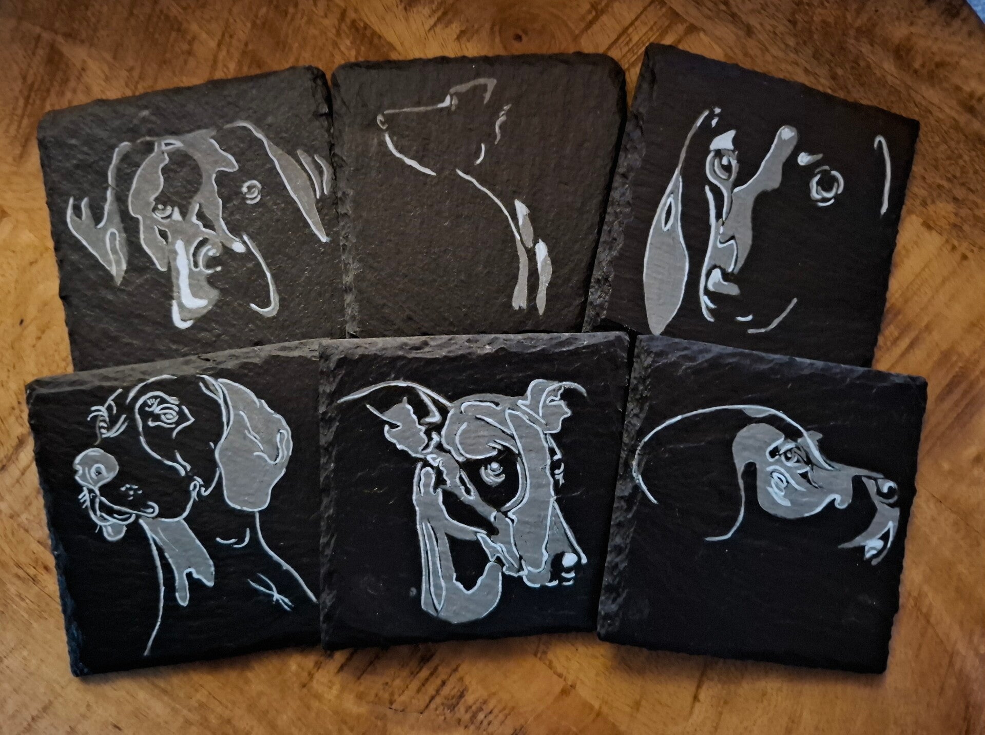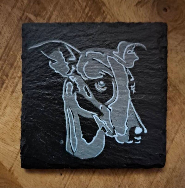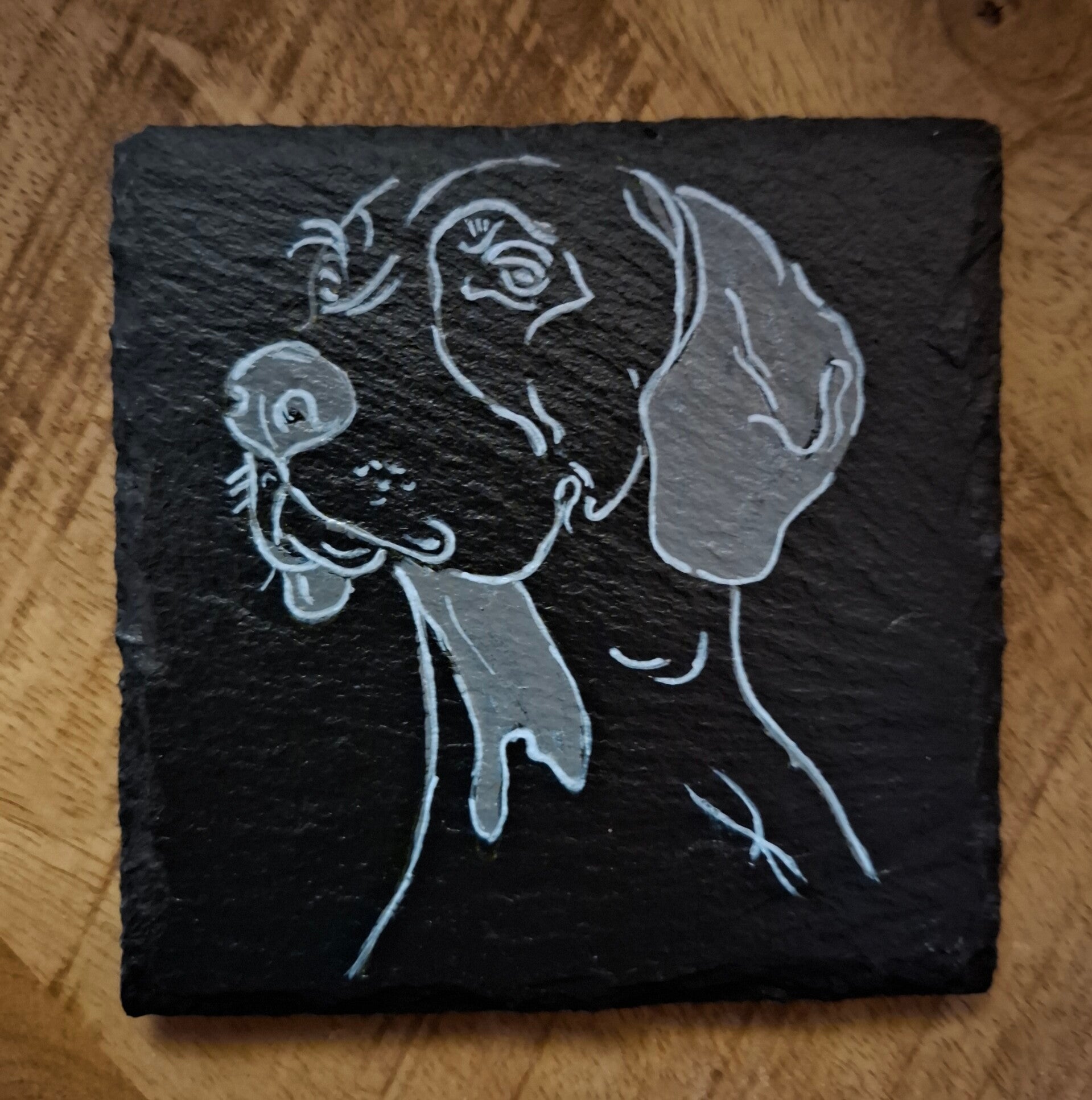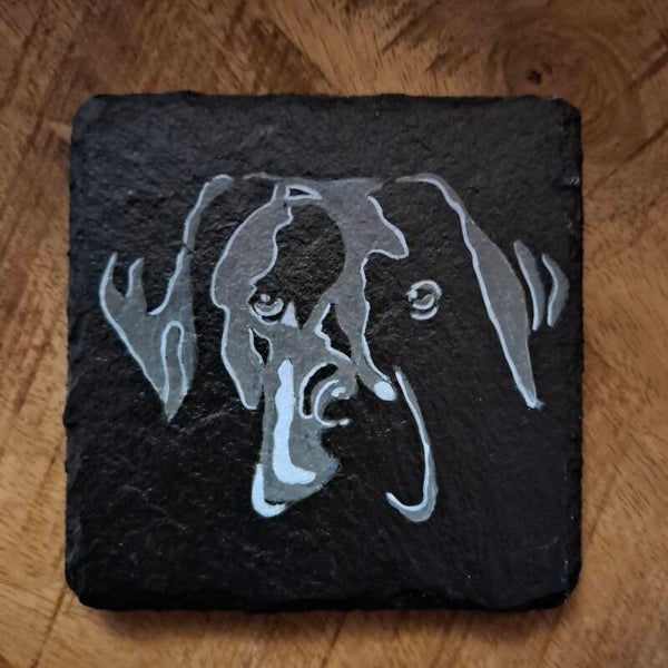 Deze set handbeschilderde leistenen onderzetters met schaduw honden is perfect voor liefhebbers van een minimalistische maar warme uitstraling. De honden worden weergegeven als elegante silhouetten, waardoor ze subtiel maar bijzonder opvallen.