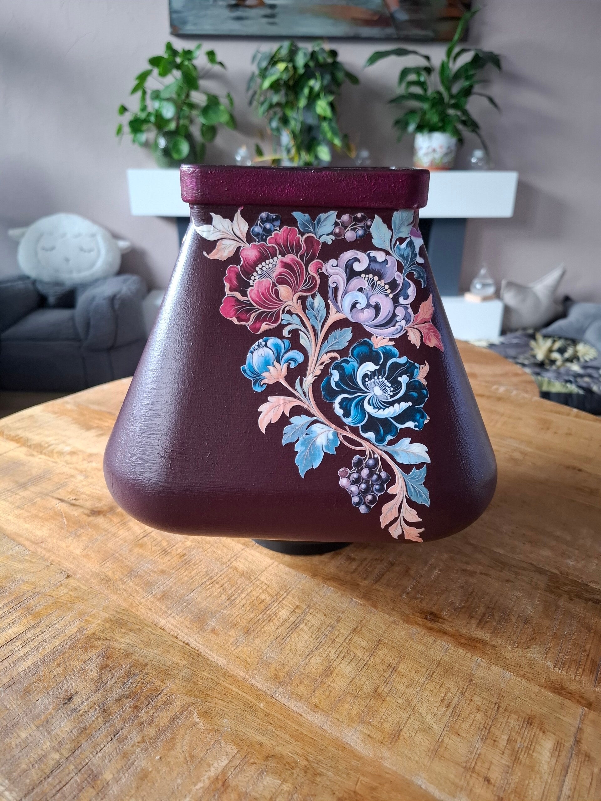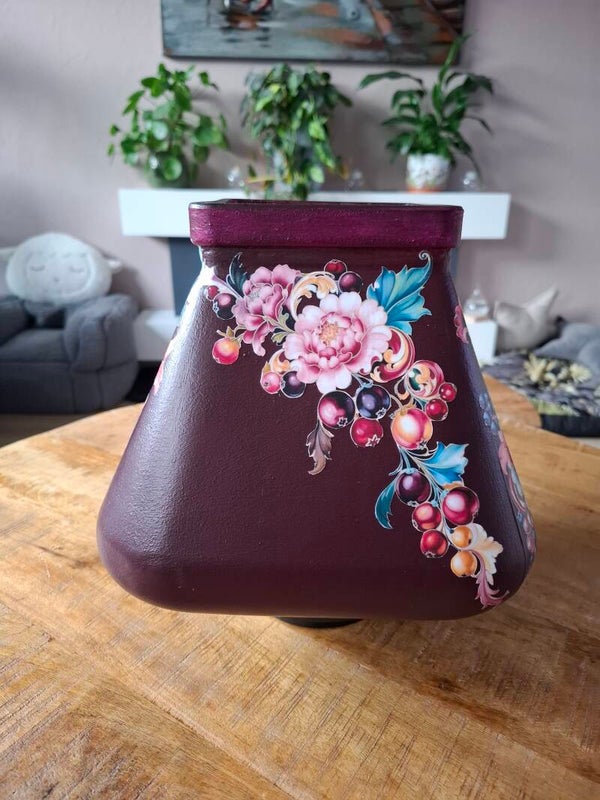 Vierkante taps toelopende vaas/pot – Donkerviolet met bloemen