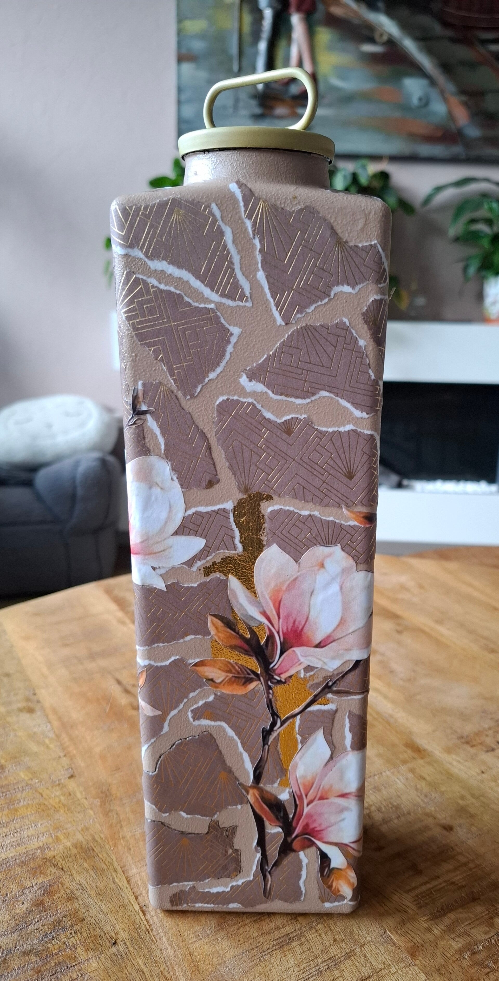 Driekantige bewerkte fles met deksel – taupe met goud en magnolia’s