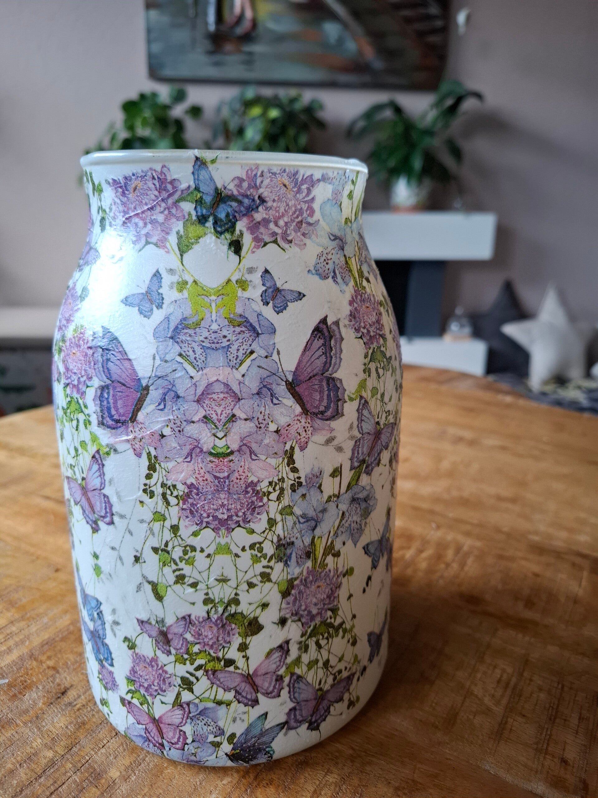 Dit lieve vaasje met paarse bloemen en speelse vlinders is een subtiel en warm cadeau voor Moederdag. De zachte tinten en fijne details geven het vaasje een dromerige uitstraling die perfect past in elk interieur. Een klein gebaar met een grote betekenis – ideaal om je moeder te verrassen met iets persoonlijks en unieks.