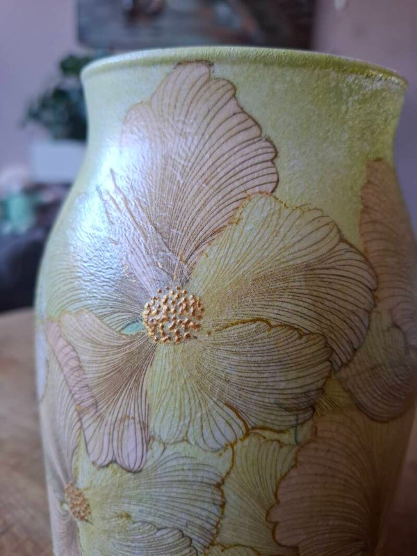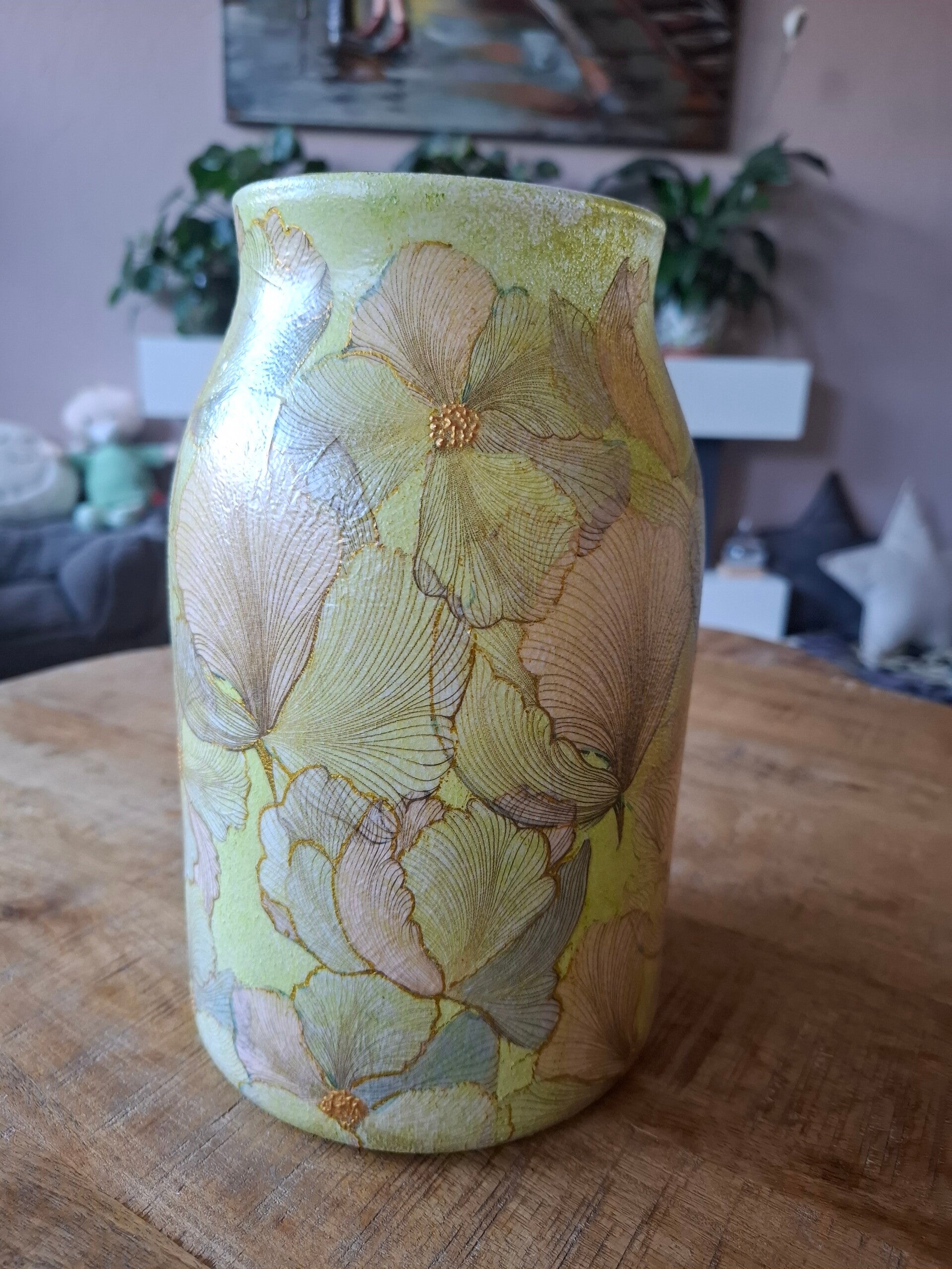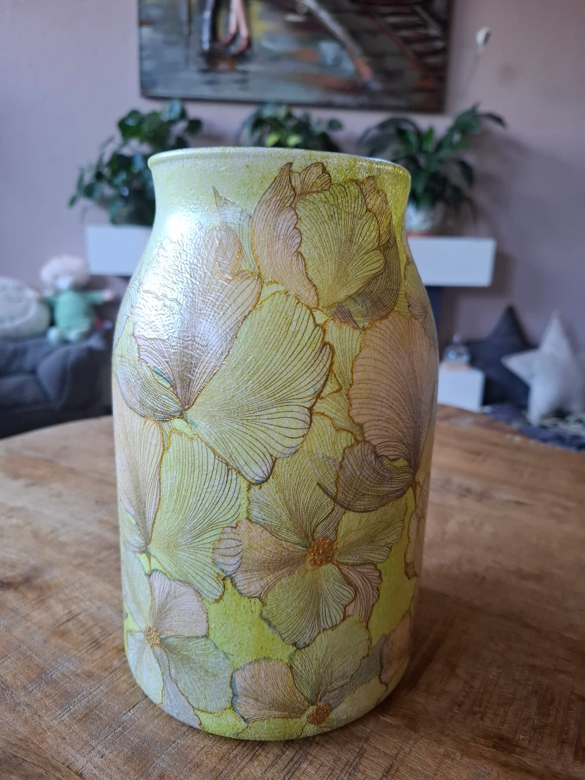 Olijfgroene vaas met ginkgobladeren – handbewerkte decoupage vaas
