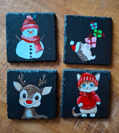 Set van vier handbeschilderde leistenen onderzetters met winterse en kerstafbeeldingen. Perfect voor de feestdagen of als origineel cadeau.